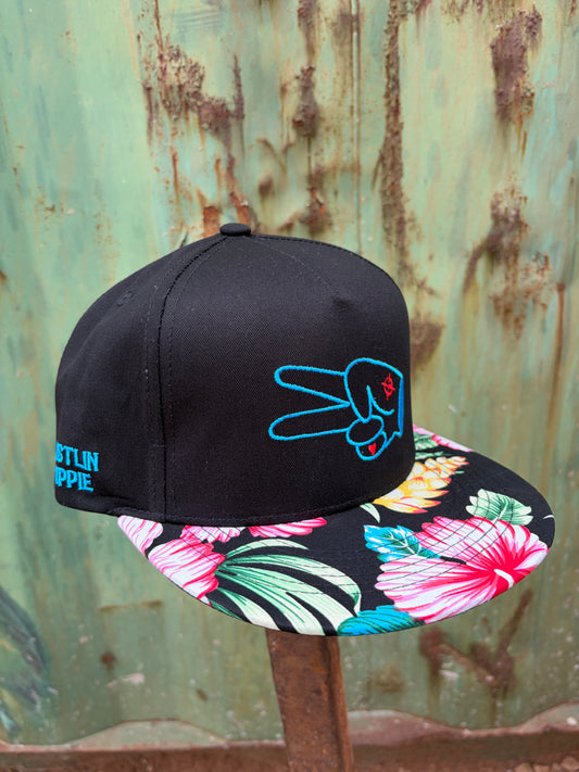 PL Series 5 Panel Snapback Hat- BLACK/FLOWER- BLUE LOGO w/ BOLD style